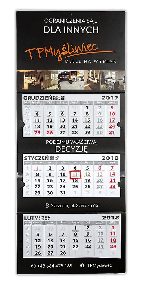 3-månadskalender är inte bara en praktisk pryl, utan också ett utmärkt reklammedium. Placerade på kontor, i receptioner eller hemma, förblir de synliga året runt. Tack vare detta exponeras företagets logotyp, reklamfras eller kontaktuppgifter ständigt. Denna typ av kalender är en ständig påminnelse om varumärket, vilket hjälper till att bygga långvariga relationer med kunderna.